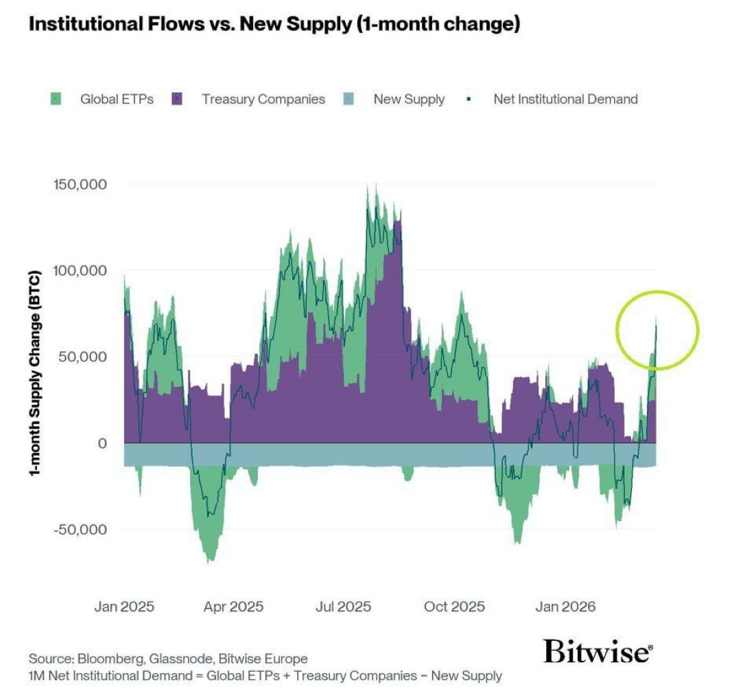 Dữ liệu từ Bitwise, Bloomberg và Glassnode vừa chỉ ra một sự mất cân bằng cung - cầu mang tính cấu trúc trên thị trường. Lực cầu từ các định chế tài chính hiện đang cao gấp 3 lần lượng Bitcoin mới được tạo ra hàng tháng bởi các thợ đào. Lần gần nhất mô hình này xuất hiện, giá Bitcoin đã nhân đôi chỉ trong vỏn vẹn 4 tháng.
